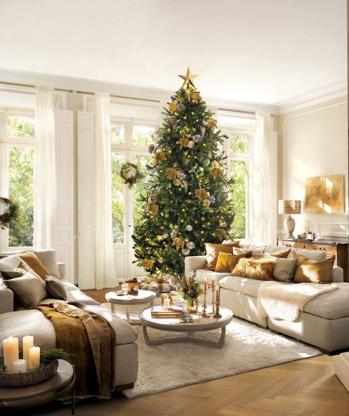 Amarilo, Oro, Ocre, mostaza... Los tonos dorados, cada uno con sus matices, son los que se llevan la corona en la decoración navideña de este año. Desde la hermosa decoración del árbol, los cojines del sofá, la pantalla de la lámpara de sobremesa o el cuadro, todo integrado y ofreciendo brillo natural en los detalles.