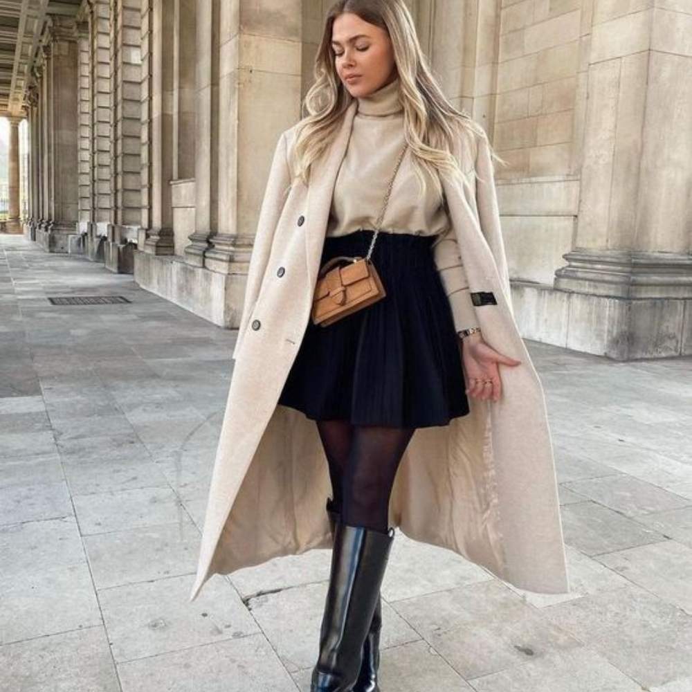 combinación de gabardina o saco largo y falda corta, también va con